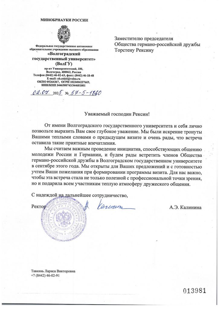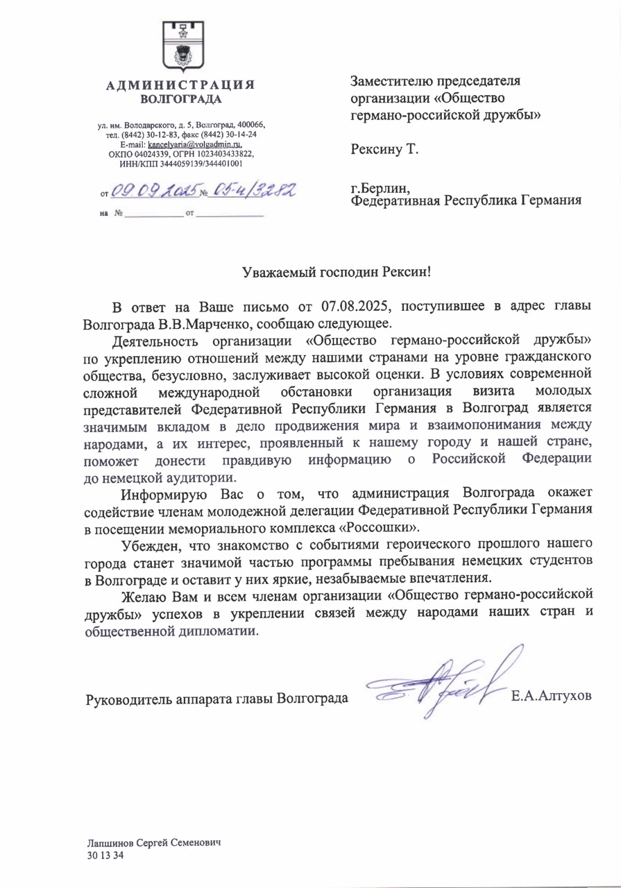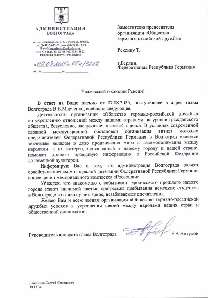 Der Leiter der Stadtverwaltung von Wolgograd, E. A. Altuchow, sandte am 9. September 2025 per Mail, an den stellvertretenden Vorsitzenden unserer Gesellschaft, Torsten Rexin, folgendes Schreiben: